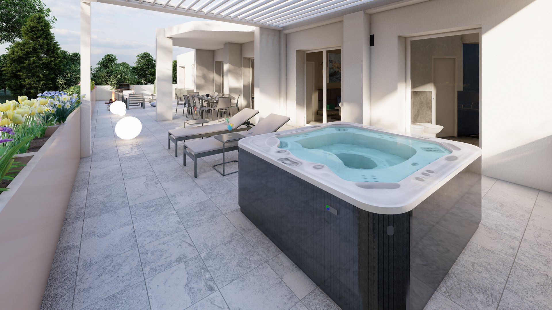 ButtonProgettazione terrazza esterna di 100 mq, con relativi arredi, costi e scelta dei materiali. Jacuzzi esterna e serra bioclimatica