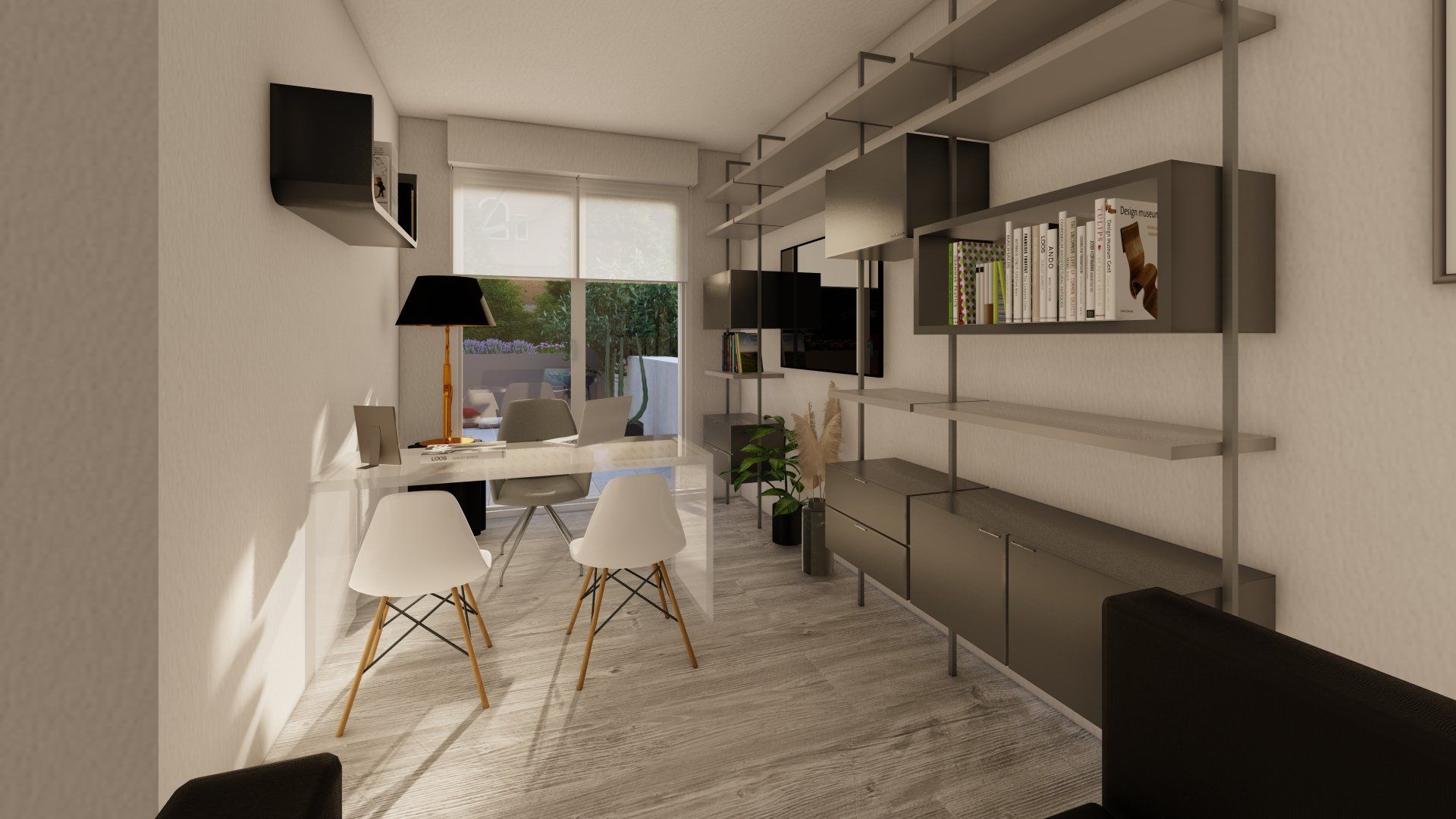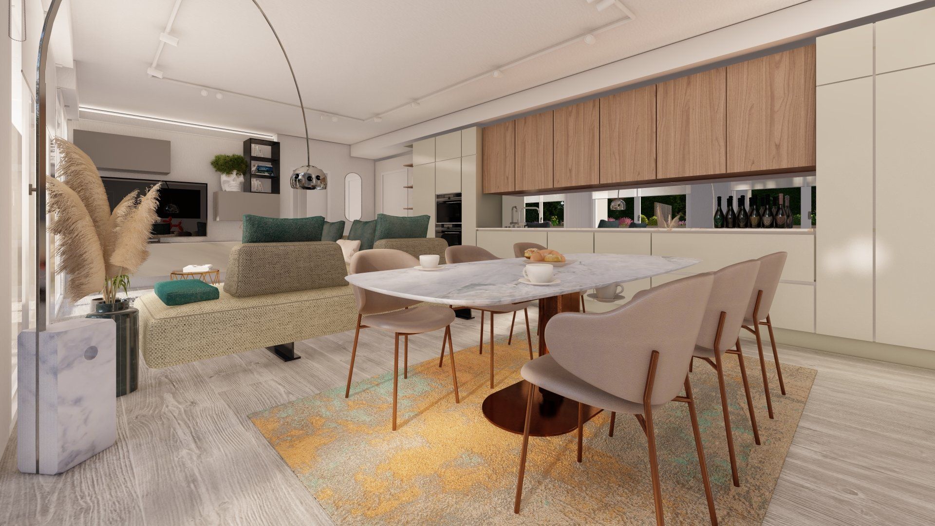 ButtonProgettazione d'interni di un appartamento a Saronno. Nel render è possibile vedere ogni arredo esattamente nelle texture e nei materiali scelti. Cucina cucine Venete, tavolo e sedie Calligaris e divano Artnova. Libreria realizzata su misura.