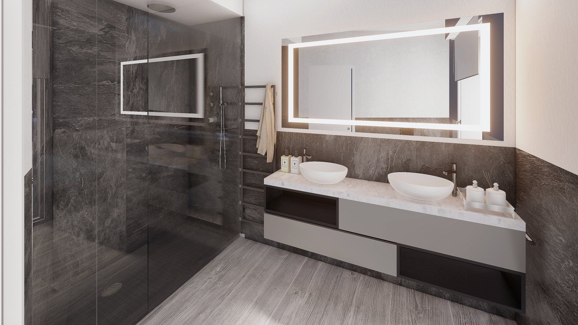 ButtonBagno di un appartamento in provincia di Milano, rivestimento in gres porcellanato effetto pietra lavagna, mobile realizzato su misura, doccia con soffione incassato.