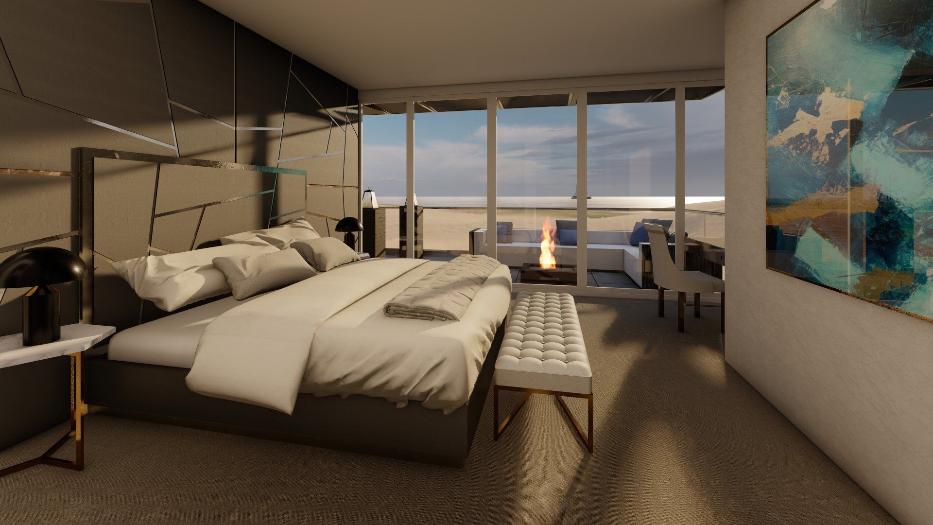 ButtonStudio per una camera d'albergo vista mare con balcone privato e testata in pelle realizzata su richiesta