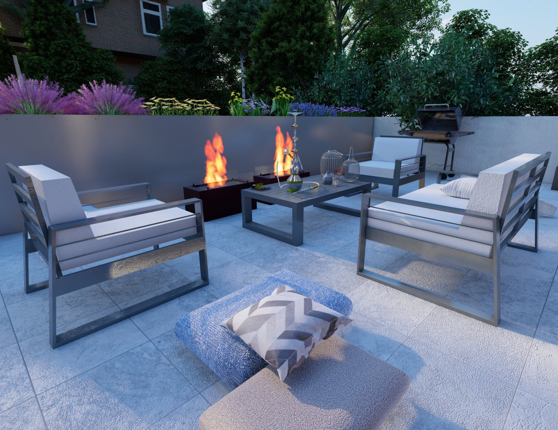 ButtonAmbiente cozy e rilassato per una terrazza all'aperto animata da bracieri a gas Gpl da esterno.