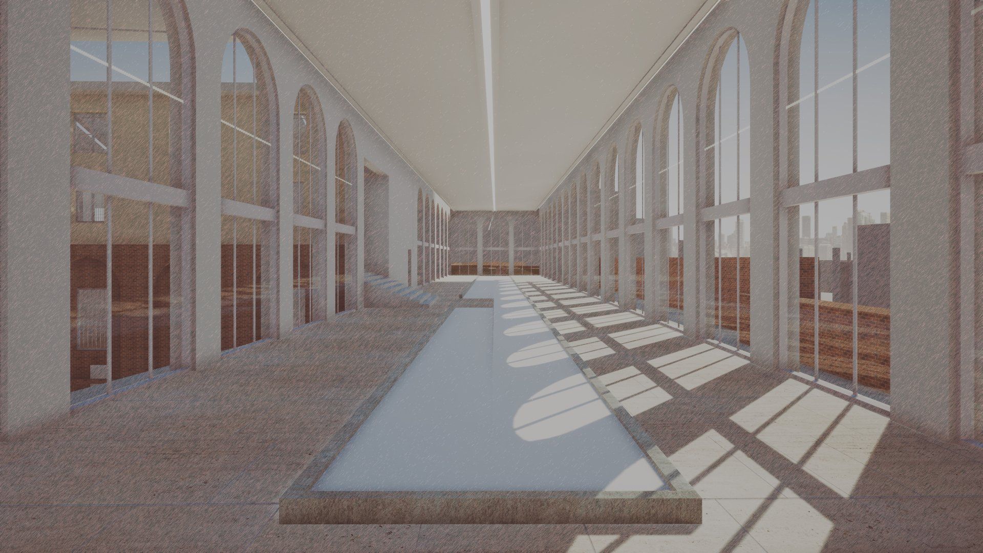 ButtonAmbientazione interna del padiglione aggiuntivo di Villa Rivaldi, sede principale del museo. Questo ambiente è pensato per eventi e sfilate.